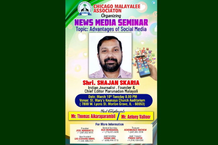 ചിക്കാഗോ: ചിക്കാഗോ മലയാളീ അസോസിയേഷന്റെ ആഭിമുഖ്യത്തിൽ സംഘടിപ്പിക്കുന്ന ന്യൂസ് മീഡിയ സെമിനാർ, 2026 മാർച്ച് മാസം 10 ചൊവ്വാഴ്ച വൈകിട്ട് 8 ന് മോർട്ടൻ ഗ്രോവ് സെന്റ് മേരീസ് ക്നാനായ ഓഡിറ്റോറിയത്തിൽ വച്ച് നടത്തപ്പെടുന്നതാണ് .പ്രമുഖ മാധ്യമ പ്രവർത്തകനും മറുനാടൻ മലയാളി ചീഫ് എഡിറ്ററും ആയ ശ്രീ ഷാജൻ സ്കറിയ ,’സാമൂഹ്യ മാധ്യമങ്ങളുടെ നേട്ടങ്ങൾ ‘എന്ന വിഷയത്തെ അധികരിച്ച് പ്രഭാഷണം നടത്തും.