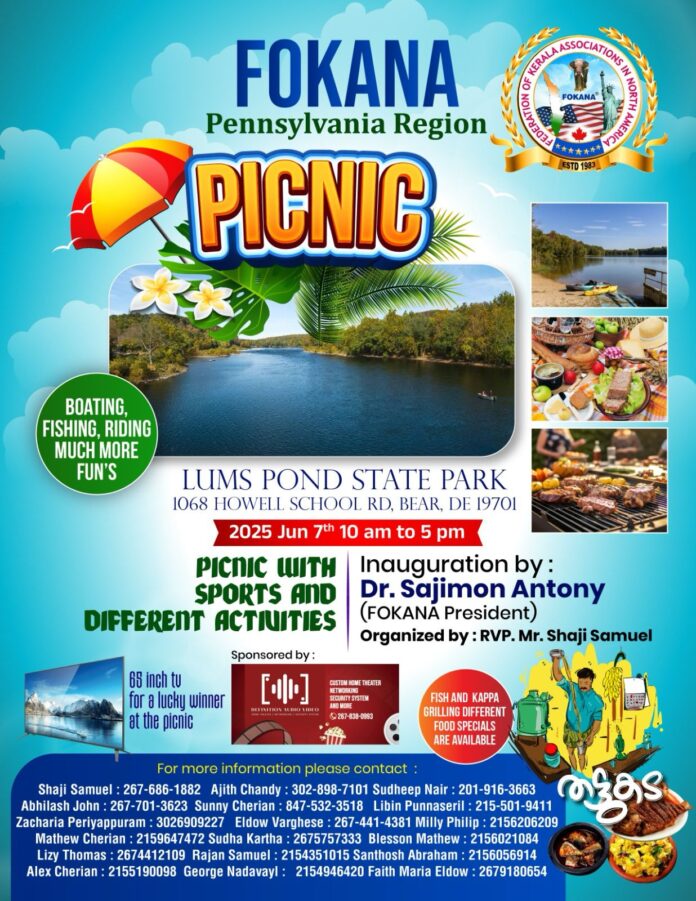പെൻസിൽവാനിയ: ഫൊക്കാന പെൻസിൽവേനിയ റീജിയന്റെ ഈ വർഷത്തെ ഫാമിലി പിക്കിനിക്ക് 2025 ജൂൺ 7 ശനിയാഴ്ച രാവിലെ 110 മണി മുതൽ 5 മണി വരെ Lums Pond State പാർക്കിൽ (1068 Howell School Road ,Bear , DE 19701 ) വെച്ച് നടത്തുന്നു.