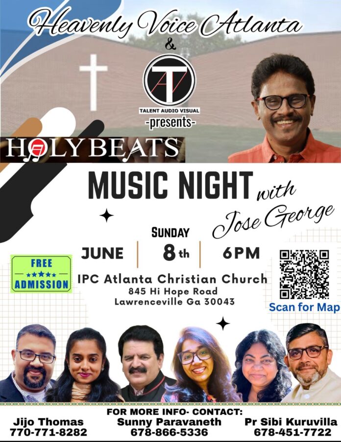 അറ്റ്ലാന്റ: ഹെവൻലി വോയ്സ് അറ്റ്ലാന്റയുടെ ആഭിമുഖ്യത്തിൽ ഹോളിബീറ്റ്സ് സംഗീത രാത്രി ജൂൺ 8 ഞായർ വൈകുന്നേരം 6 ന് സംഘടിപ്പിക്കുന്നു ഐപിസി അറ്റ്ലാന്റ ക്രിസ്ത്യൻ ചർച്ചിൽ (845 ഹായ് ഹോപ്പ് റോഡ് ലോറൻസ്വില്ലെ 30043) ജോസ് ജോർജിന്റെ നേത്ര്വത്വത്തിൽ നടക്കുന്ന മ്യൂസിക് നൈറ്റിലേക് പ്രവേശനം