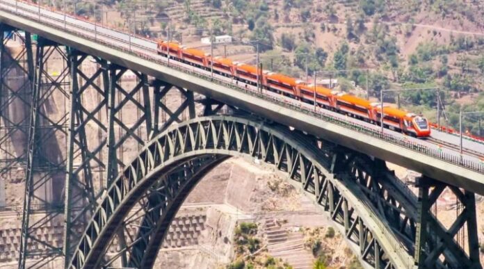 ചെനാബ് പാലത്തിന്റെ ഭംഗി ആസ്വദിക്കാനാകണം എൻജിൻ ഡ്രൈവർ ട്രെയിനിന്റെ വേഗത കുറച്ചു. പാലത്തിന്റെ ഇരുഭാഗങ്ങളിലും നടപ്പാതകളുണ്ട്. റിയാസി ജില്ലയിലെ കൗരി, ബക്കൽ ഗ്രാമങ്ങൾക്ക് ഇടയിൽ ചെനാബ് നദിക്ക് കുറുകെയുള്ള ലോകത്തെ ഏറ്റവും ഉയരംകൂടിയ റെയിൽവേ ആർച്ച് പാലത്തിലൂടെ ഞങ്ങളുടെ ട്രെയിൻ മുന്നോട്ട് നീങ്ങി. ചെനാബ് നദീതടത്തിൽനിന്നും 359 മീറ്റർ ഉയരത്തിലുള്ള ഈ പാലം ഈഫൽ ടവറിനെക്കാൾ 35 മീറ്റർ ഉയരത്തിലാണ്. താഴെ ചെനാബ് നദി ശാന്തമായി ഒഴുക്കുന്നത് കാണാം. ട്രെയിനിനുള്ളിൽ ഇരുന്നുകൊണ്ട് ഈ പാലത്തിന്റെ സൗന്ദര്യം ആസ്വദിക്കുന്നതിന് പരിമിതികളുണ്ട്. എന്നാൽ, പിർ പഞ്ചാൽ മലനിരകൾക്ക് അപ്പുറത്തുനിന്ന് എത്തുന്ന സൂര്യപ്രകാശത്തിൽ ചെനാബ് പാലത്തിന്റെ കൈവരികൾ വെട്ടിത്തിളങ്ങുന്നത് കാണാമായിരുന്നു. മറ്റൊരു തുരങ്കത്തിലേക്ക് പ്രവേശിക്കാനായി ട്രെയിൻ ചെറുതായി വളയുന്നതിനിടെ പ്രൗഢഗംഭീരമായ ചെനാബ് പാലത്തിന്റെ കമാനവും താഴ് ഭാഗവും ഒരു നോക്ക് കണ്ടു.