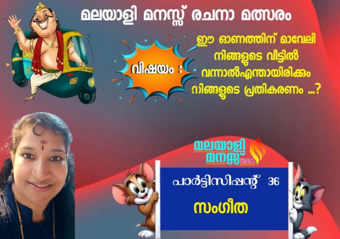 തിരുവോണനാളിൽ മുറ്റമടിച്ചു കൊണ്ടിരിക്കേയാണ് എന്റെ മുന്നിൽ മാവേലിത്തമ്പുരാൻ പ്രത്യക്ഷപ്പെടുന്നത്. പെട്ടന്ന് ഞാനൊന്ന് ഞെട്ടി.പിന്നെ സുബോധം വീണ്ടെടുത്തെങ്കിലും വെപ്രാളത്തിൽ ചൂലുപിടിച്ചു കൊണ്ടു തന്നെ മാവേലിയെ വണങ്ങേണ്ടി വന്നു.