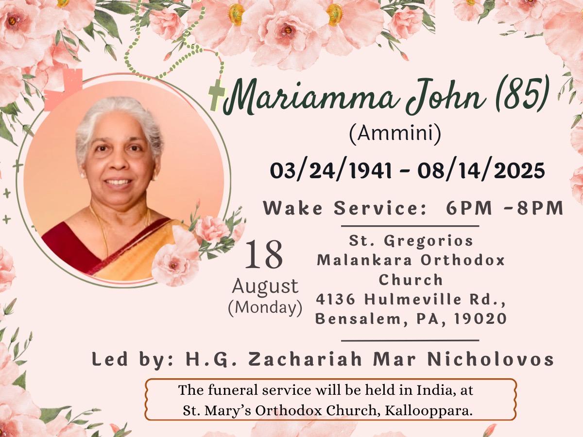ഫിലഡൽഫിയാ: മാഷർ സ്ട്രീറ്റ്, സെന്റ് തോമസ് മലങ്കര ഓർത്തഡോക്സ് ചർച്ച് വികാരി റവ. ഫാ. ഡോ. ജോൺസൺ സി. ജോണിന്റെ മാതാവും, തിരുവല്ല തുകലശ്ശേരിയിൽ, പരേതരായ ചുങ്കത്തിൽ വർഗീസ് മത്തായിയുടെയും, ശ്രീമതി മറിയാമ്മ മത്തായിയുടെയും മകളും, പരേതനായ ശ്രീ. സി. എം. ജോൺ ചിറത്തലക്കലിന്റെ സഹധർമ്മിണിയുമായിരുന്ന ശ്രീമതി മറിയാമ്മ ജോൺ (അമ്മിണി – 84) ഫിലഡൽഫിയായിൽ അന്തരിച്ചു. സംസ്ക്കാരം പിന്നീട് കേരളത്തിലെ കല്ലൂപ്പാറയിലുള്ള സെന്റ് മേരീസ് ഓർത്തഡോക്സ് പള്ളിയിൽ നടക്കും.