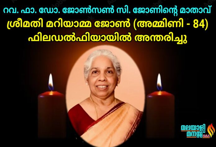 ഫിലഡൽഫിയാ: മാഷർ സ്ട്രീറ്റ്, സെന്റ് തോമസ് മലങ്കര ഓർത്തഡോക്സ് ചർച്ച് വികാരി റവ. ഫാ. ഡോ. ജോൺസൺ സി. ജോണിന്റെ മാതാവും, തിരുവല്ല തുകലശ്ശേരിയിൽ, പരേതരായ ചുങ്കത്തിൽ വർഗീസ് മത്തായിയുടെയും, ശ്രീമതി മറിയാമ്മ മത്തായിയുടെയും മകളും, പരേതനായ ശ്രീ. സി. എം. ജോൺ ചിറത്തലക്കലിന്റെ സഹധർമ്മിണിയുമായിരുന്ന ശ്രീമതി മറിയാമ്മ ജോൺ (അമ്മിണി – 84) ഫിലഡൽഫിയായിൽ അന്തരിച്ചു. സംസ്ക്കാരം പിന്നീട് കേരളത്തിലെ കല്ലൂപ്പാറയിലുള്ള സെന്റ് മേരീസ് ഓർത്തഡോക്സ് പള്ളിയിൽ നടക്കും.