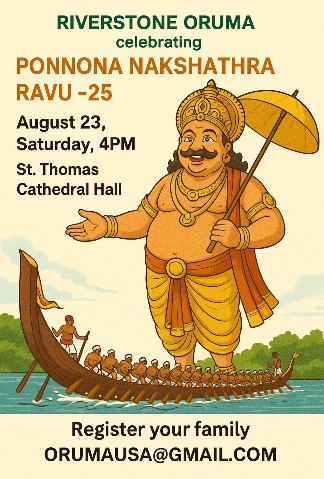 ഷുഗർലാൻഡ് ഗ്രേറ്റർ ഹൂസ്റ്റണിലെ ശക്തമായ കമ്യൂണിറ്റി ഓർഗനൈസേഷനായ റിവർസ്റ്റോൺ ഒരുമയുടെ ഓണാഘോഷം ഓഗസ്റ്റ് 23 നു ശനിയാഴ്ച്ച വൈകുന്നേരം 4.00 മുതൽ 9.30 വരെ സ്റ്റാഫോർഡ് സെന്റ് തോമസ് ഓർത്തഡോക്സ് കത്തീഡ്രൽ ആഡിറ്റോറിയത്തിൽ വച്ച് നടക്കും