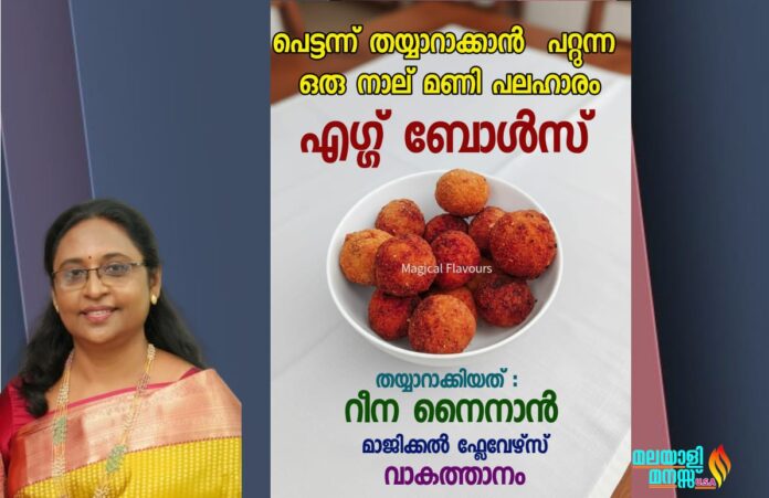 പെട്ടെന്ന് തയ്യാറാക്കാൻ പറ്റുന്ന ഒരു നാലുമണി പലഹാരമായ “എഗ്ഗ് ബോൾസ്” ന്റെ റെസിപ്പിയാണ് ഞാൻ ഇന്ന് പരിചയപ്പെടുത്തുന്നത്. കുട്ടികൾക്കും മുതിർന്നവർക്കും ഒരുപോലെ ഇഷ്ടപ്പെടുന്ന ഈ പലഹാരം എല്ലാവരും തയ്യാറാക്കി നോക്കണേ. ഇനി ഇത് തയ്യാറാക്കുന്നത് എങ്ങനെ എന്ന് നോക്കാം.