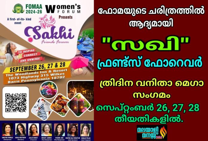 പെൻസിൽവേനിയ: അമേരിക്കൻ മലയാളികളുടെ അഭിമാന സംഘടനയായ ഫോമയുടെ പ്രവർത്തന ചരിത്രത്തിൽ ആദ്യമായി ഫോമ നാഷണൽ വുമൻസ് ഫോറം അണിയിച്ചൊരുക്കുന്ന ത്രിദിന വനിതാ മെഗാ സംഗമം, “സഖി – ഫ്രണ്ട്സ് ഫോറെവർ” എന്ന പേരിൽ വിമൻസ് സമ്മിറ്റ് സെപ്റ്റംബർ 26, 27, 28 തീയതികളിൽ, വിനോദസഞ്ചാരികളുടെ മനംകവർന്ന, പെൻസിൽവേനിയയിലെ പ്രശസ്തവും, പ്രകൃതിരമണീയവുമായ പോക്കനോസിലെ, വുഡ്ലാന്റ്സ് റിസോർട്ടിൽവച്ചു നടത്തപ്പെടുന്നു.
