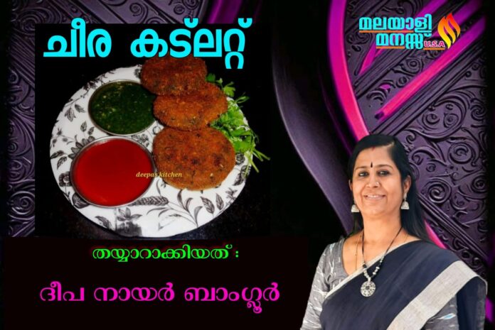 മഴയുള്ളപ്പോൾ ചൂടുചായയുടെ കൂടെ എന്തെങ്കിലും കഴിക്കുന്നത് പതിവല്ലേ. ഇന്നത്തെ വിഭവം ചീര കട്ലറ്റ് ആണ്