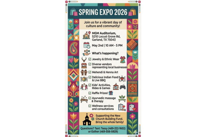 ഗാർലൻഡ് (ടെക്സാസ്): വസന്തകാലത്തിന്റെ വരവേൽപ്പിനായി വൈവിധ്യമാർന്ന കലാ-സാംസ്കാരിക പരിപാടികളോടെ ‘സ്പ്രിംഗ് എക്സ്പോ 2026’ സംഘടിപ്പിക്കുന്നു. പുതിയ പള്ളി മന്ദിരത്തിനായുള്ള ഫണ്ട് ശേഖരണാർത്ഥം നടത്തുന്ന ഈ മേള മെയ് 2-ാം തീയതി ശനിയാഴ്ച രാവിലെ 10 മണി മുതൽ വൈകുന്നേരം 5 മണി വരെ ഗാർലൻഡിലെ എം.ജി.എം ഓഡിറ്റോറിയത്തിൽ (MGM Auditorium, 5210 Locust Grove Rd, Garland, TX 75043) വെച്ച് നടക്കും.