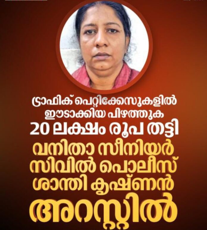 മൂവാറ്റുപുഴ : ഗതാഗത നിയമ ലംഘനത്തിനുള്ള പിഴത്തുക തട്ടിയെടുത്ത കേസില് വനിതാ പൊലീസ് ഉദ്യോഗസ്ഥയെ കസ്റ്റഡിയിലെടുത്ത് മൂവാറ്റുപുഴ പൊലീസ്. മൂവാറ്റുപുഴ ട്രാഫിക് എൻഫോഴ്സ്മെന്റ് യൂണിറ്റിൽ റൈറ്ററായിരുന്ന ശാന്തി കൃഷ്ണനെയാണ് കോട്ടയം കിടങ്ങൂരിലെ ബന്ധുവീട്ടില് ഒളിവില് കഴിയവെ മൂവാറ്റുപുഴ ഡിവൈഎസ്പിയുടെ നേതൃത്വത്തിലുള്ള അന്വേഷണസംഘം കസ്റ്റഡിയിലെടുത്തത്. വകുപ്പുതല നടപടിയുടെ ഭാഗമായി ശാന്തികൃഷ്ണനെ നേരത്തെ സസ്പെന്ഡ് ചെയ്തിരുന്നു.