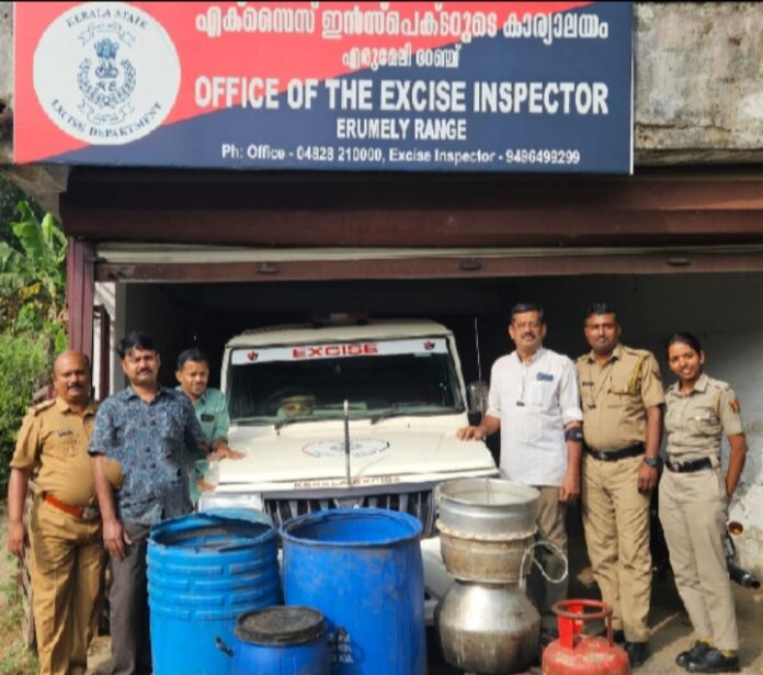 വാറ്റാനായി കരുതി വച്ചിരുന്നതാണ് കോടയും മറ്റ് വാറ്റുപകരണങ്ങളും എരുമേലി അസിസ്റ്റൻ്റ് എക്സൈസ് ഇൻസ്പെക്ടർ ടോജോ . ടി .ഞള്ളിയിലിൻ്റെ നേതൃത്വത്തിലുള്ള എക്സൈസ് സംഘമാണ് പിടികൂടിയത്.