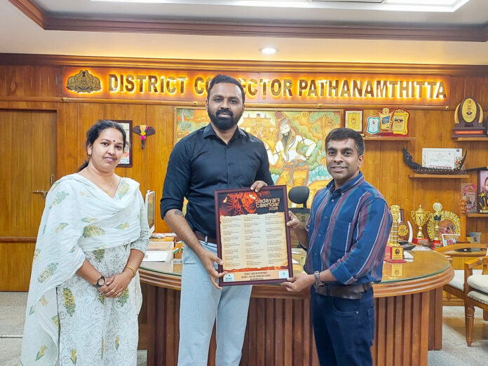 പത്തനംതിട്ട ജില്ലയുടെ പരമ്പരാഗത കലാരൂപമായ പടയണിയുടെ വിവരവുമായി ജില്ലാ ടൂറിസം പ്രമോഷന് കൗണ്സില് തയാറാക്കിയ കലണ്ടര് ജില്ലാ കലക്ടര് എസ് പ്രേം കൃഷ്ണന് ഡിറ്റിപിസി സെക്രട്ടറി കെ ജി അജേഷിന് കൈമാറി പ്രകാശനം ചെയ്തു.