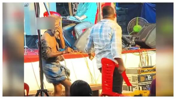 സ്‌റ്റേജിന് മുന്നിലേക്ക് എത്തിയ വ്യക്തി പ്ലാസ്റ്റിക് കസേര കൊണ്ട് ബാലചന്ദ്രനെ അടിച്ചു. മർദ്ദനത്തിൽ മുഖത്തിന് പരിക്കേറ്റു. കൊല്ലം നഗരത്തിൽ ആക്രിപെറുക്കി വിറ്റ് കഴിയുന്ന ബാലചന്ദ്രൻ റോഡ് അരികിലാണ് കിടക്കുന്നത്. മർദ്ദന ദൃശ്യം സമൂഹ മാധ്യമത്തിൽ പ്രചരിച്ചതോടെ വ്യാപക രോഷമാണ് ഉയരുന്നത്. മദ്യപിച്ച് നൃത്തം ചെയ്തയാളെ പിടിച്ചു മാറ്റുന്നതിന് പകരം കസേര കൊണ്ട് അടിച്ചത് ക്രൂരതയാണെന്നും നടപടി വേണമെന്നുമാണ് ആവശ്യം.