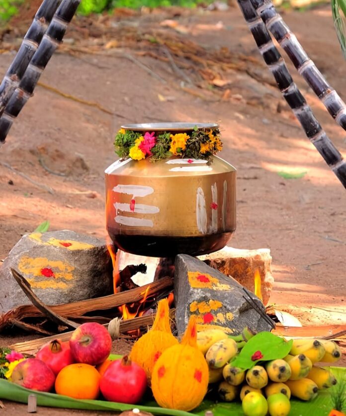 പൊങ്കലിനു പുതിയ പാത്രത്തിൽ പാലിൽ അരി വേവിക്കുന്നു