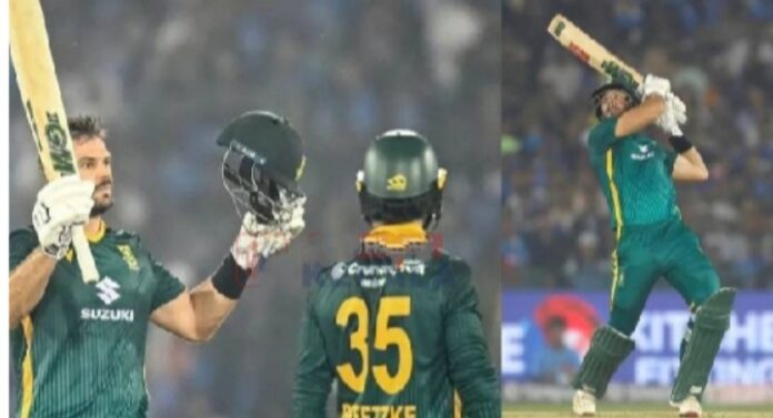 മറുപടി ബാറ്റിങ്ങിനിറങ്ങിയ ദക്ഷിണാഫ്രിക്കയ്ക്ക് തുടക്കത്തിൽ ക്വന്റൺ ഡി കോക്കിനെ നഷ്ടമായി. പിന്നാലെ രണ്ടാം വിക്കറ്റിൽ മികച്ച കൂട്ടുകെട്ടുമായി മാർക്രമും തെംബ ബാവുമയും ദക്ഷിണാഫ്രിക്കയെ മികച്ച സ്കോറിലേക്ക് നയിച്ചു. 101 റൺസിന്റെ കൂട്ടുകെട്ടാണ് ഇരുവരും രണ്ടാം വിക്കറ്റിൽ പടുത്തുയർത്തിയത്. മാർക്രത്തിന്റെ മിന്നും പ്രകടനമാണ് പ്രോട്ടീസിന് കരുത്തായത്. 98 പന്തിൽ നിന്ന് 110 റൺസാണ് താരം അടിച്ചു കൂട്ടിയത്. 10 ഫോറും നാല് സിക്സറും അടങ്ങുന്നതായിരുന്നു താരത്തിന്റെ ഇന്നിങ്സ്.മാർക്രം പുറത്തായതോടെ ദക്ഷിണാഫ്രിക്കയെ മാത്യൂ ബ്രീറ്റ്സ്കെ, ഡെവാൾഡ് ബ്രവിസ് ചേർന്ന് ജയത്തിലേക്ക് നയിച്ചു. 34 പന്തിൽ നിന്ന് 54 റൺസാണ് ഡെവാൾഡ് ബ്രവിസ് നേടിയത്. 68 റൺസാണ് മാത്യൂ ബ്രീറ്റ്സ്കെ നേടിയത്. നാലാം വിക്കറ്റിൽ ഇരുവരും 92 റൺസാണ് അടിച്ചുകൂട്ടിയത്.